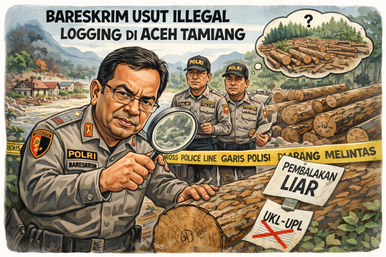 Aceh Tamiang – Direktorat Tindak Pidana Tertentu (Dittipidter) Bareskrim Polri turun langsung ke Kabupaten Aceh Tamiang, Provinsi Aceh, untuk mengusut keberadaan gelondongan kayu yang diduga menjadi penyebab banjir bandang di wilayah tersebut, Selasa, (06/01/2026).