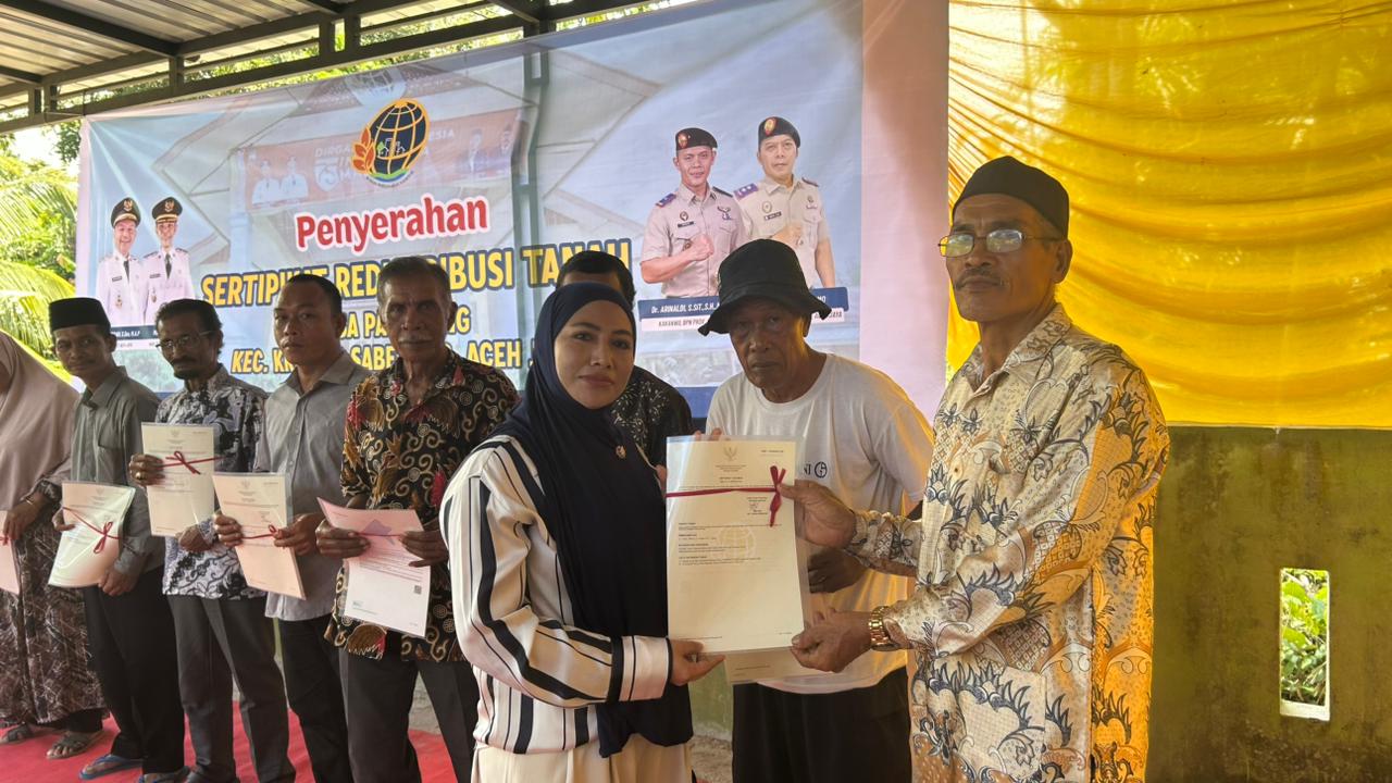 Aceh Jaya — Ketua TP PKK Aceh Jaya, Desi Maulidar, turut mendampingi Bupati Aceh Jaya dalam kegiatan penyerahan sertifikat program redistribusi tanah kepada masyarakat, Senin (07/4/2026).