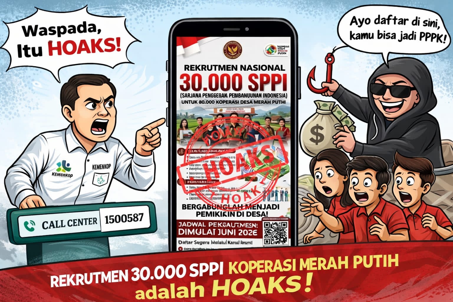 Melalui akun resmi media sosialnya, Kementerian Koperasi menegaskan bahwa informasi mengenai rekrutmen nasional 30.000 SPPI untuk 80.000 Koperasi Desa Merah Putih yang beredar luas di media sosial merupakan hoaks dan bukan berasal dari kanal resmi pemerintah.